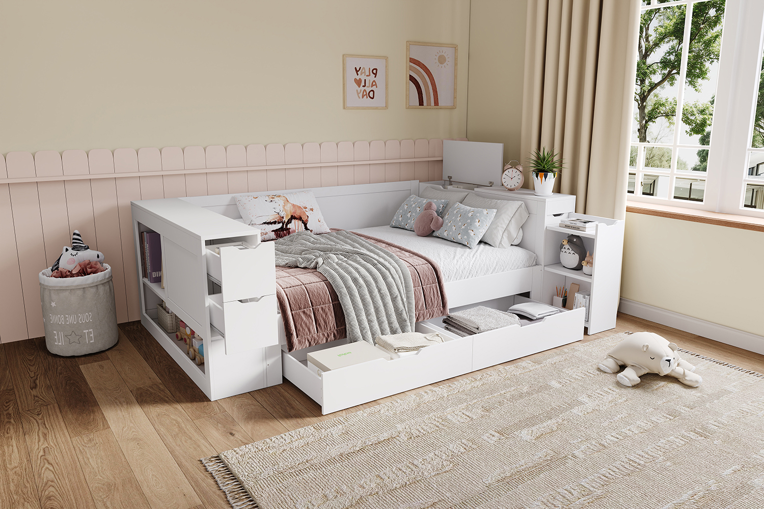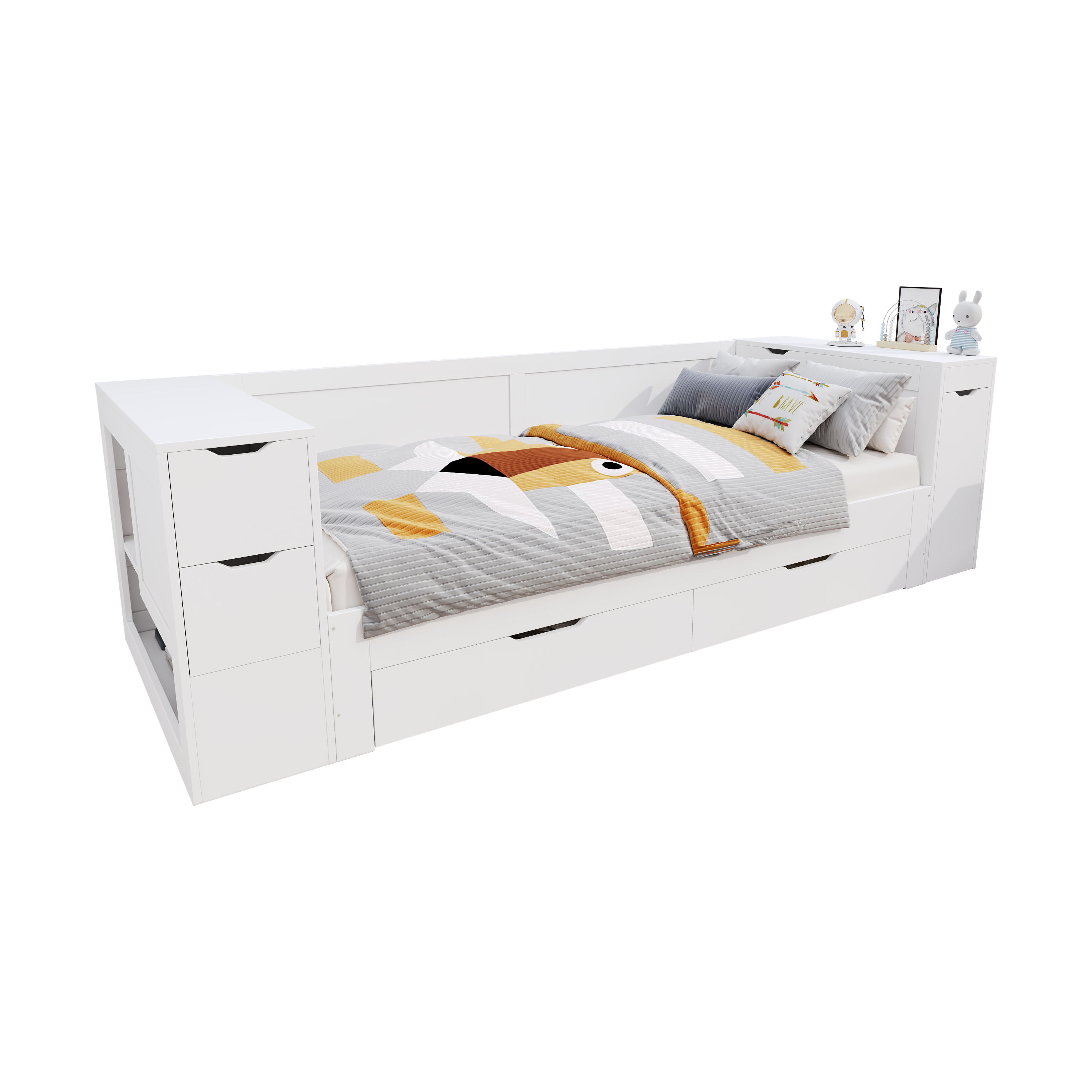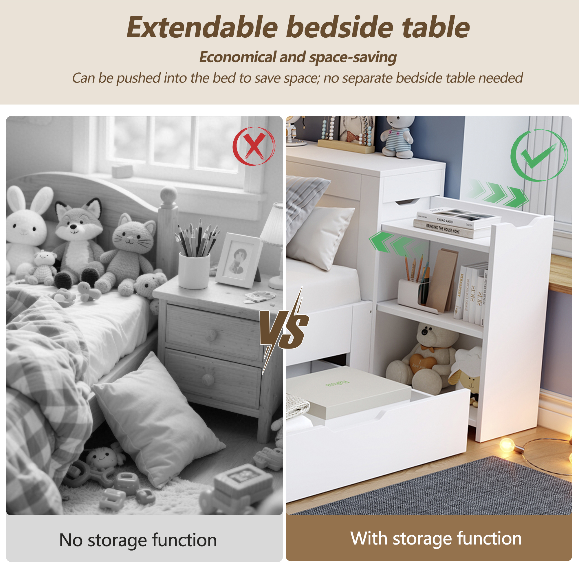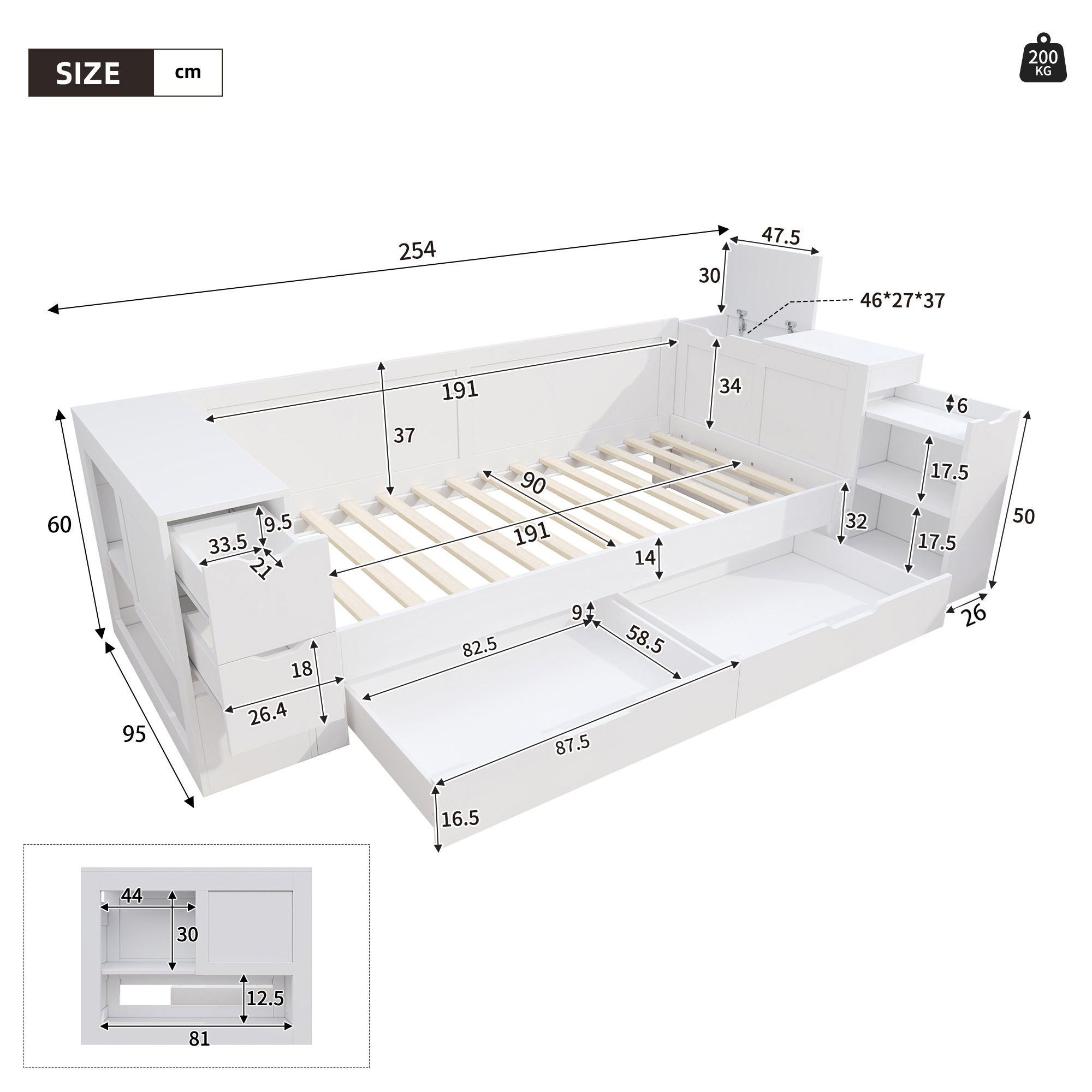 Product Name:Children's bed, daybed, 3ft-90 x 190 cm, single bed, multifunctional children's bed with drawers, shelves and storage space, with bedside table, with storage space, without mattress, white
