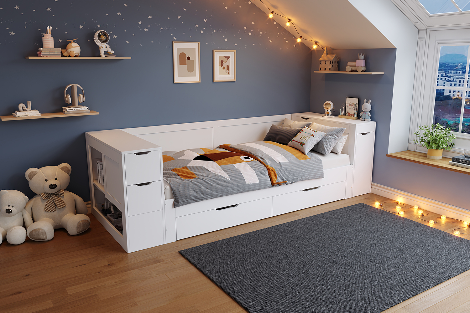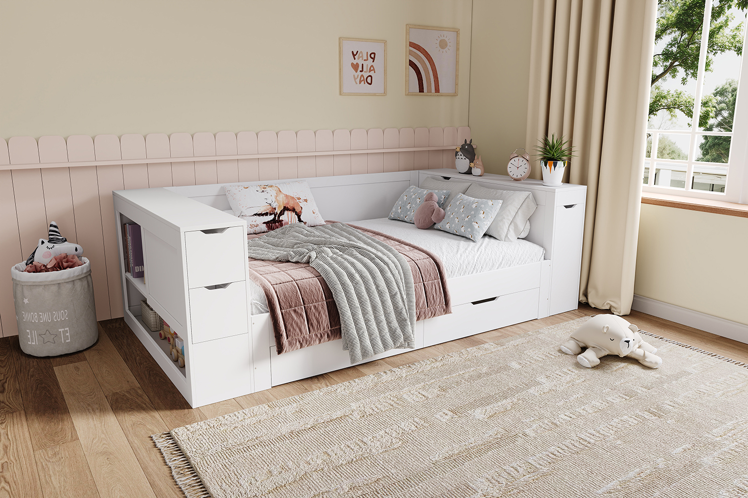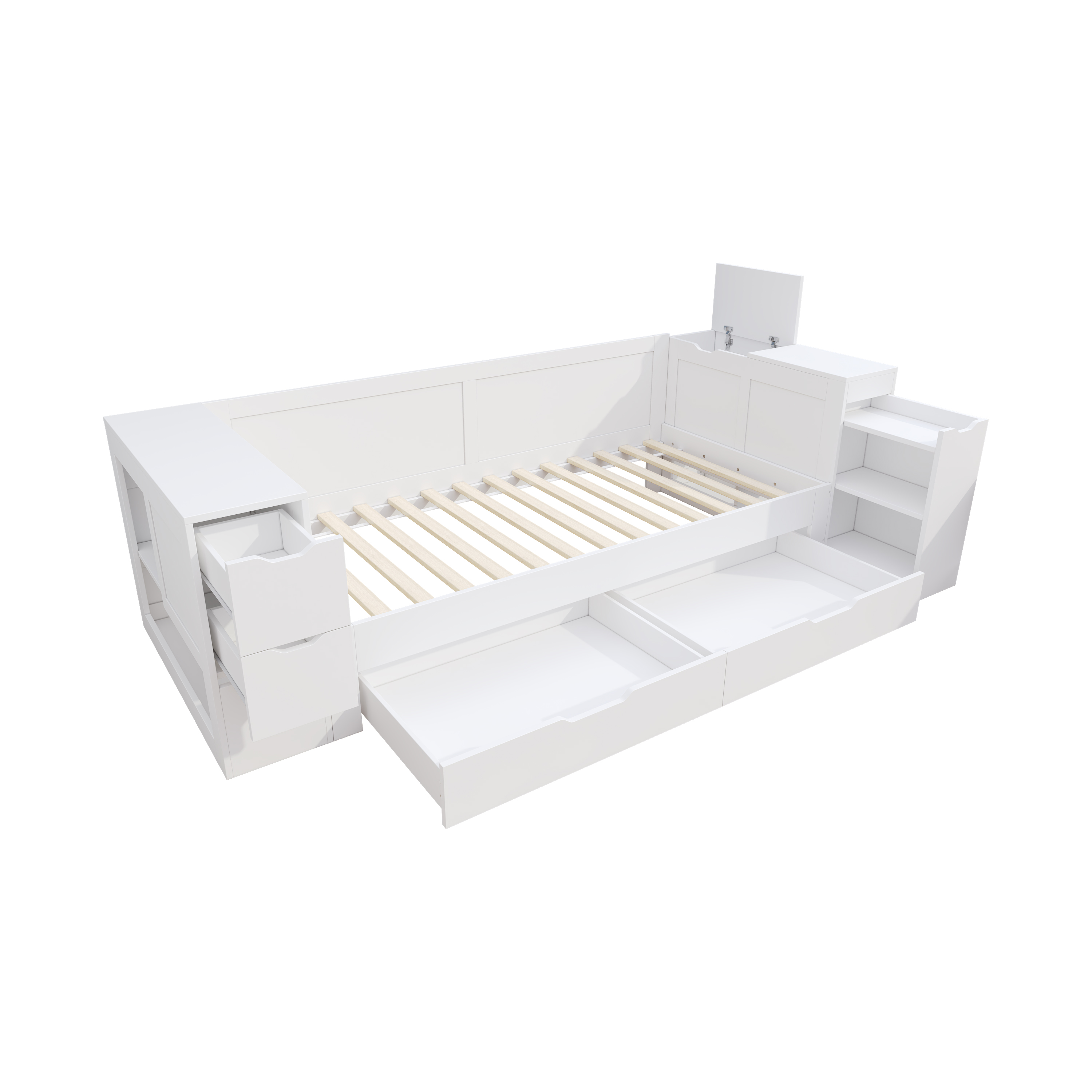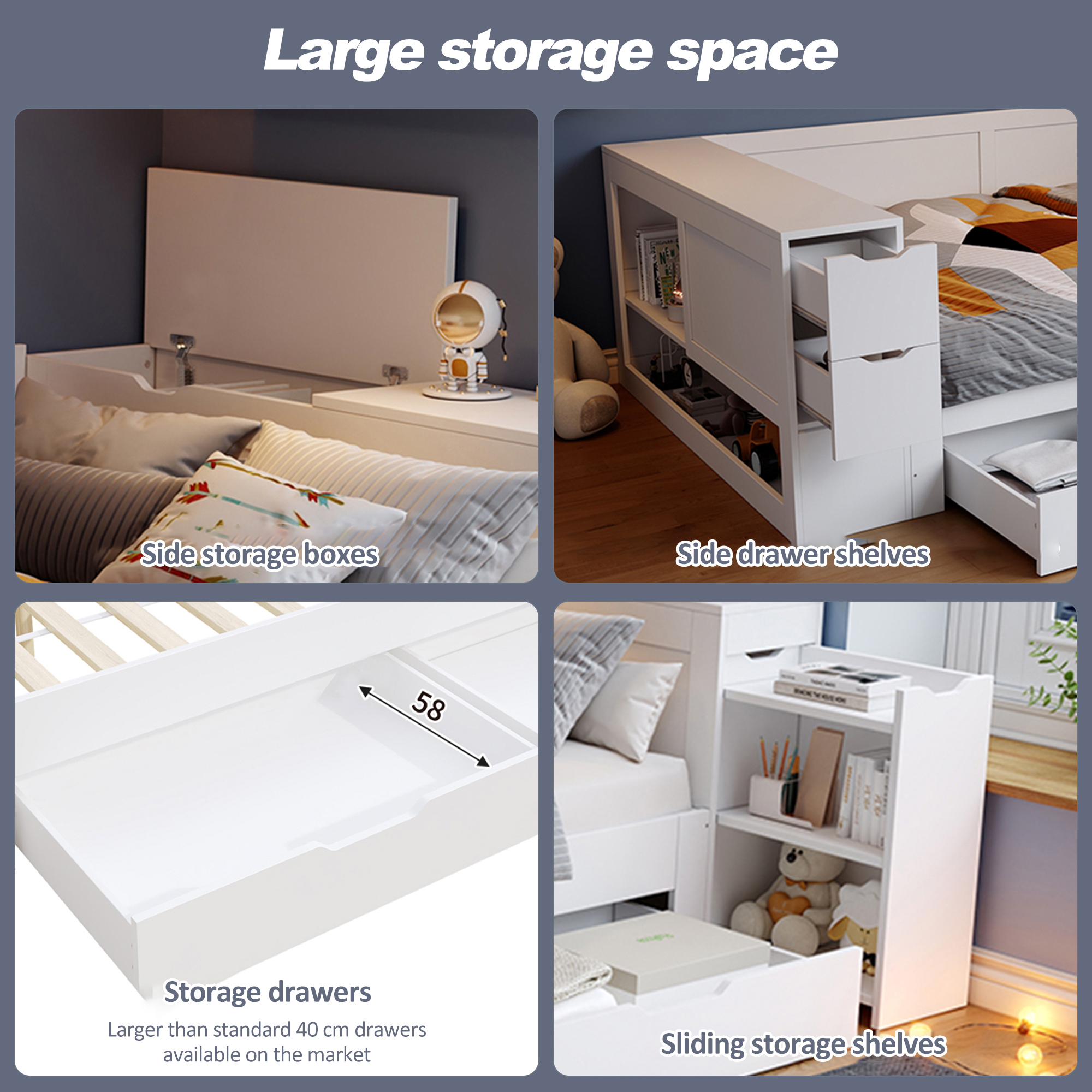 Product Name:Children's bed, daybed, 3ft-90 x 190 cm, single bed, multifunctional children's bed with drawers, shelves and storage space, with bedside table, with storage space, without mattress, white