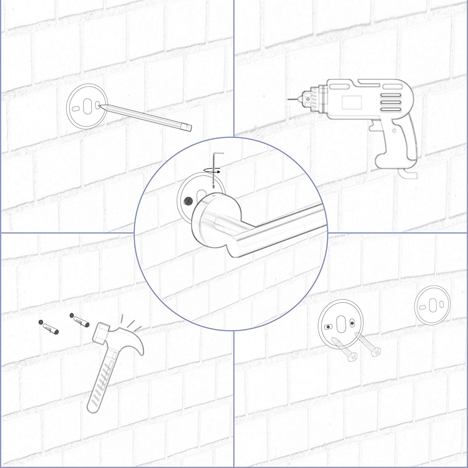 The bathroom hardware set includes: hand towel bar, toilet paper holder, towel ring, 2 multifunctional hooks. They suitable for different style decoration.Select premium SUS 304 as raw material, solid, rust-free, can handle your bath towels without bending over. Delicate finish resists daily scratches, corrosion and tarnishing, always offering a brand-new look all the time.Our bathroom towel holders are not hardware merely for bathroom, they can be your home organizers for a clean definition. Kitchen cabinet, garage door, bedroom ...The hanger will show your its versatility with its perfect size and minimalist style.Designed with clean lines and sturdy construction, the towel bars provide everyday efficiency with style. Unique round shape and concealed mounting hole add more modern elements for your room decor.
